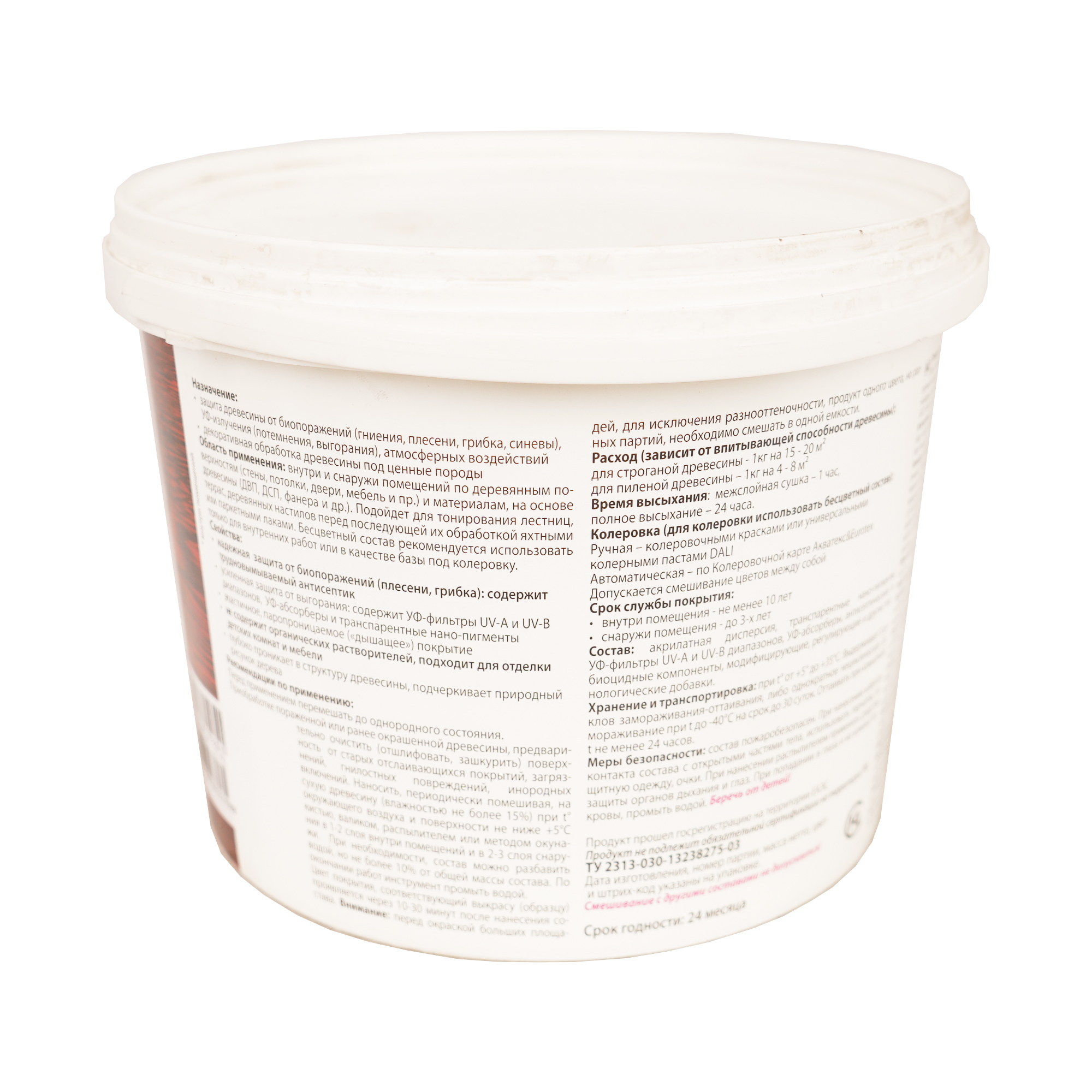 Содержит антисептик для дерева экологичный: не содержит органических растворителей, не имеет неприятного запаха, быстро сохнет.